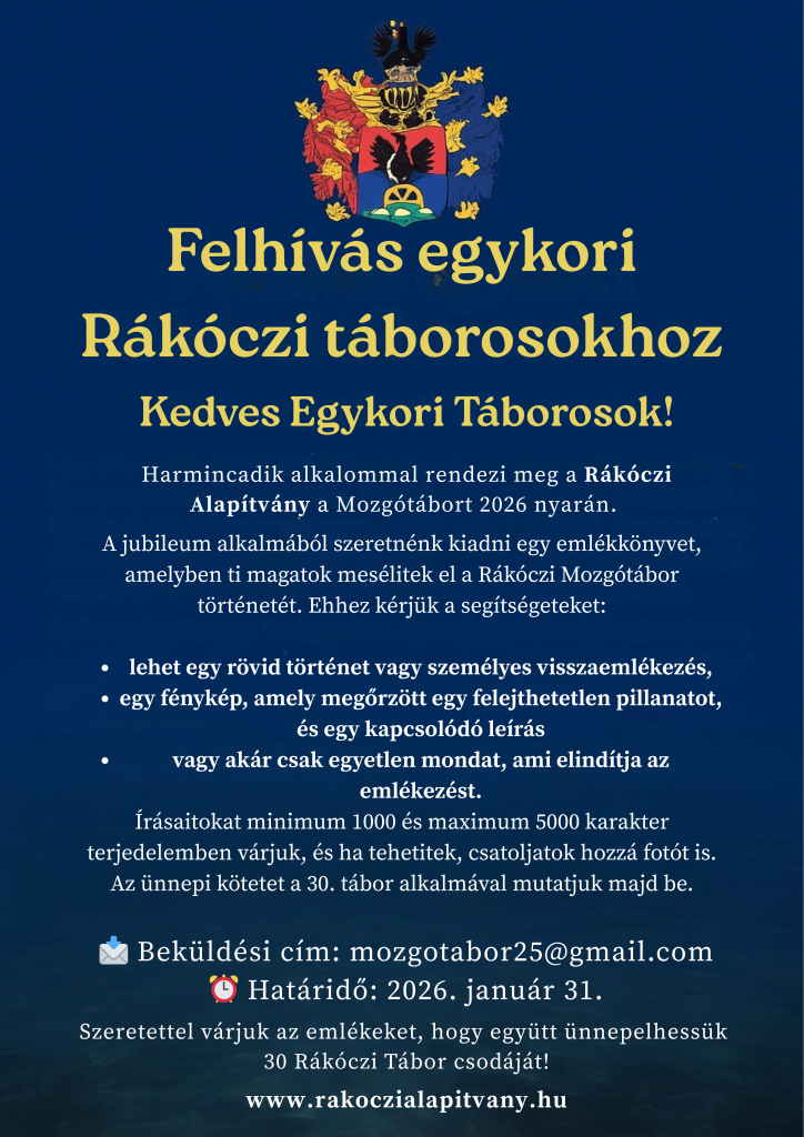 Ezért arra kérünk Benneteket, hogy legyetek aktív részesei e jubileumnak: osszatok meg velünk egy-egy emléket, élményt vagy történetet, amely ma is a szívetekben él, és amelyről úgy érzitek, hogy a Rákóczi Tábor megváltoztatta az életeteket.
